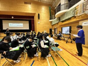 中学生の皆さんが、真剣な表情で話を聞きメモを取っていたり、質問に手を挙げ答えてくれるなど